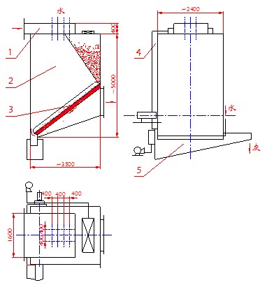 1、煙道 2、殼體 3、濾層 4、濾料循環(huán) 5、清洗分離池